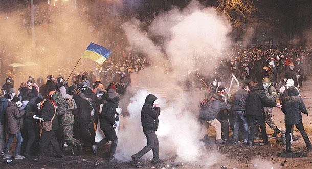 اشتبك محتجون مع قوات الأمن في العاصمة الأوكرانية كييف، أول من أمس، بعد إصدار قانون صارم ضد المظاهرات تقول المعارضة إنه يمهد الطريق لعودة الدولة البوليسية. وهاجمت مجموعة من المتظاهرين الملثمين رجال الشرطة بالهراوات، وحاولوا قلب حافلة استخدمتها الشرطة لإغلاق الطريق الرئيس المؤدي إلى مبنى البرلمان، بعد أن دعا ساسة معارضون الناس إلى تجاهل القانون الجديد.