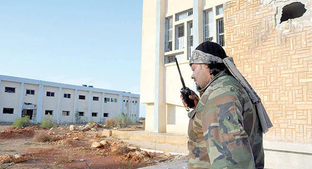 جندي من الجيش الليبي يتحدث في جهاز لاسلكي ويظهر خلفه مبنى ظهرت عليه آثار الاشتباكات مع المسلحين في بنغازي أمس (أ.ب)