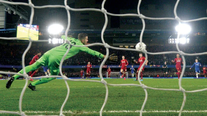 أدريان حارس ليفربول في محاولة يائسة للتصدي لتسديدة باركلي نجم تشيلسي (إ.ب.أ)