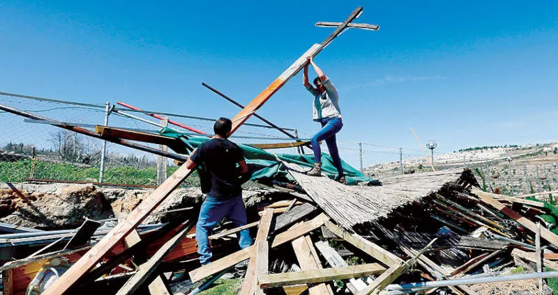 فلسطينيان من بيت جالا في الضفة الغربية وسط أنقاض مبنى هدمه مستوطنون أمس (رويترز)