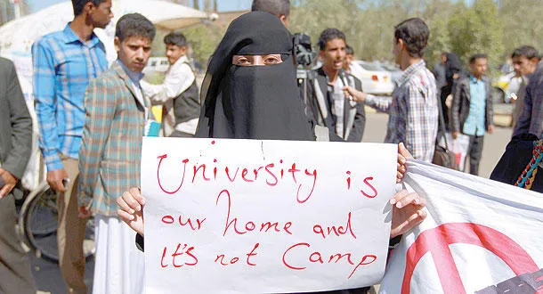 طالبة يمنية تحمل لافتة كتب عليها (الجامعة ليست معسكرا) خلال مسيرة احتجاج ضد الحوثيين بجامعة صنعاء أمس (أ.ف.ب)