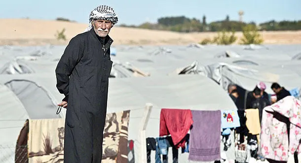 مسن كردي أمام مخيم للاجئين في بلدة تركية على الحدود مع سوريا (أ.ف.ب)