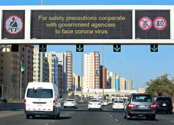لوحة إرشادية في العاصمة الكويت تدعو للتعاون مع الجهات المختصة لمواجهة كورونا (ا.ف.ب)