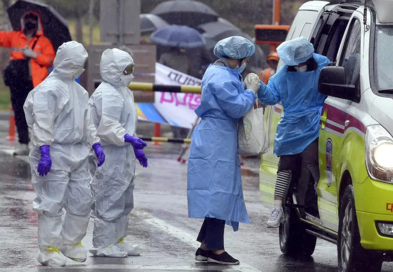 مصابان بفيروس «كورونا» يصلان إلى مستشفى في غوانغجو بكوريا الجنوبية (أ.ب)