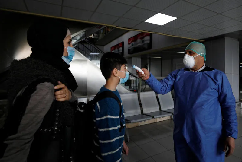 أطباء يفحصون المسافرين في مطار دمشق (رويترز)