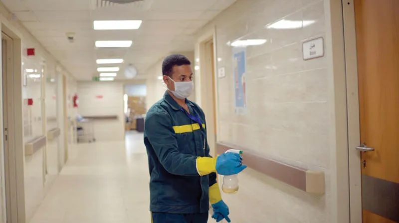 مصري يعقم أحد ممرات مستشفى الأقصر (إ.ب.أ)