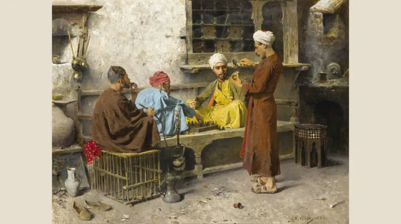 وتصور لوحة الفنان النمساوي تشارلز فيلدا (نمساوي، 1854 - 1907)، لعبة شطرنج وهو عنوان اللوحة، ومثل الكثير من الفنانين المستشرقين، سافر فيلدا إلى مصر في أوائل ثمانينات القرن التاسع عشر وأنشأ مرسماً في القاهرة، حيث أصبح لديه اهتمام كبير بتصوير الحياة المصرية اليومية.