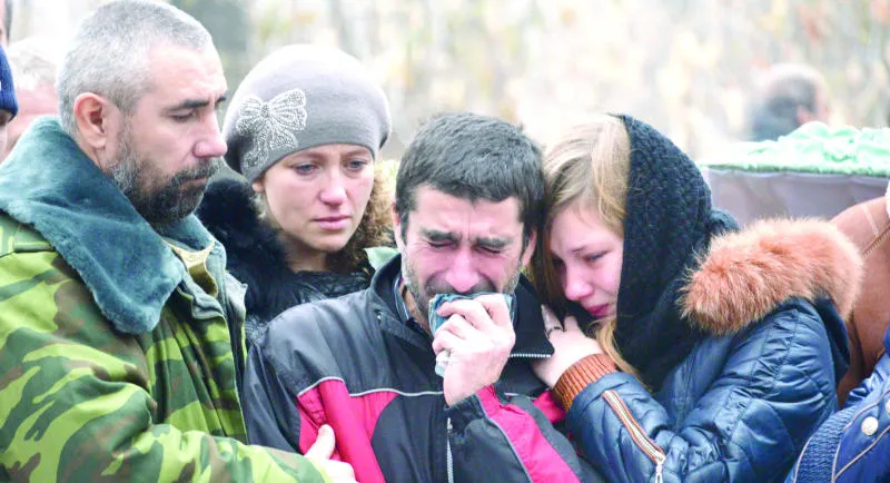 أقارب يبكون شابا وفتاة قتلا في قصف استهدف مدرستهما خلال جنازتهما في مدينة دونيتسك بشرق أوكرانيا أمس (أ.ب)