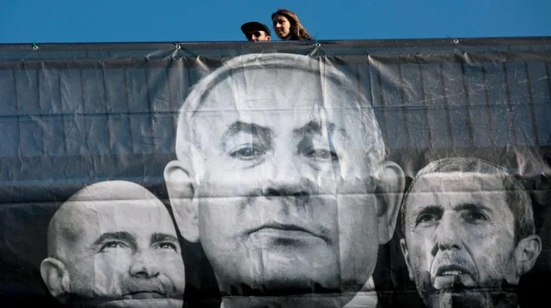 لافتة دعائية للانتخابات الإسرائيلية الثالثة تظهر نتنياهو واثنين من قياديي حزبه (أ.ب)