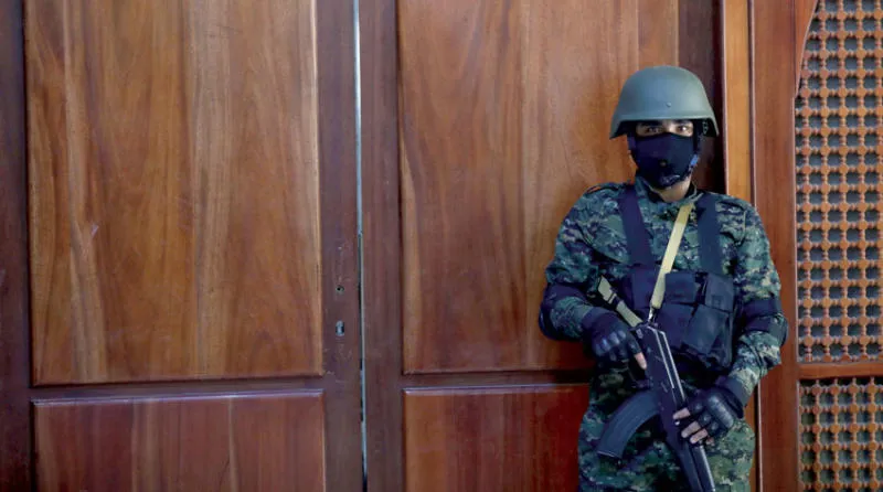 عنصر أمني في مقر رسمي للحكومة غير المعترف بها دولياً في صنعاء (رويترز)