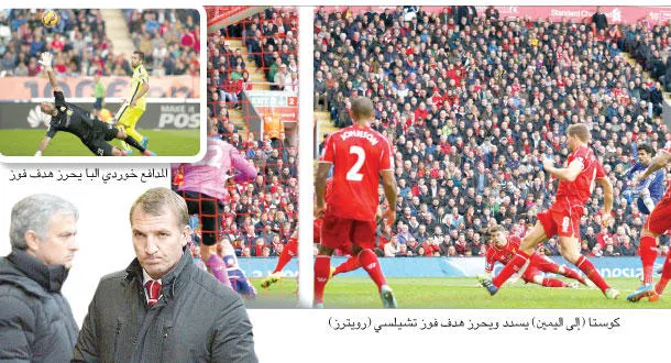 منح هدفان عن طريق غاري كاهيل ودييغو كوستا لتشيلسي فوزا مستحقا على مضيفه ليفربول، بعدما نجح في تعويض تأخره، أمس. وبقي تشيلسي على بعد 4 نقاط أمام ملاحقه ساوثهامبتون، الذي تغلب 2 - صفر على ضيفه ليستر سيتي. وتغلب مانشستر يونايتد على ضيفه كريستال بالاس، في حين تغلب بيرنلي على ضيفه هال سيتي، محققا أول انتصاراته في الدوري هذا الموسم. وتعادل وستهام يونايتد من دون أهداف في ضيافة أستون فيلا.
