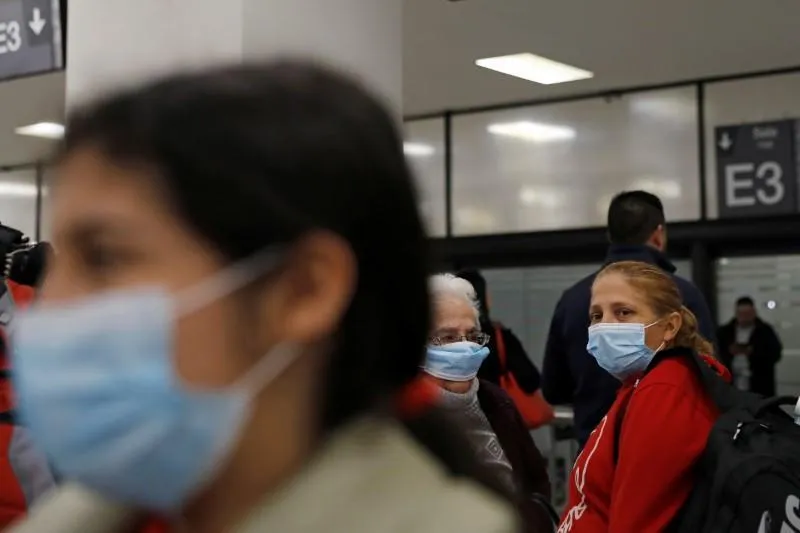 مسافرون يضعون كمامات طبية عند وصولهم إلى مطار بينيتو خواريز الدولي في مكسيكو سيتي (رويترز)