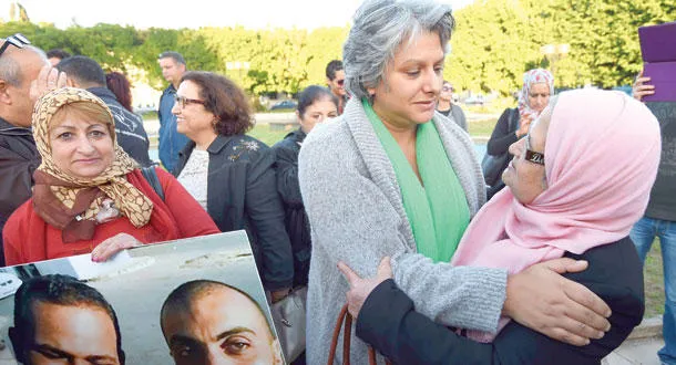 أرملة المعارض التونسي الراحل شكري بلعيد تحتضن والدة الصحافي سفيان الشرابي في تونس أمس (أ.ف.ب)