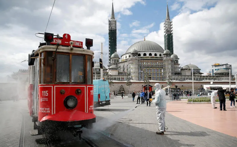 عامل ببلدية إسطنبول يقوم بتطهير ترام لمنع انتشار فيروس كورونا (رويترز)