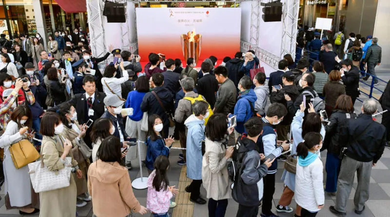 طابور من اليابانيين يرتدون الأقنعة في طريقهم لإلقاء نظرة على شعلة الأولمبياد (أ.ب)