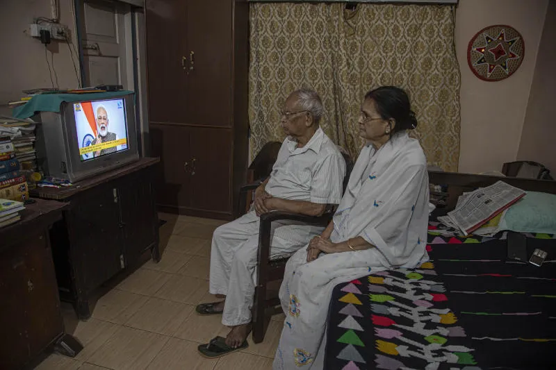 زوجان هنديان يشاهدان كلمة رئيس الوزراء ناريندرا مودي (أ.ب)
