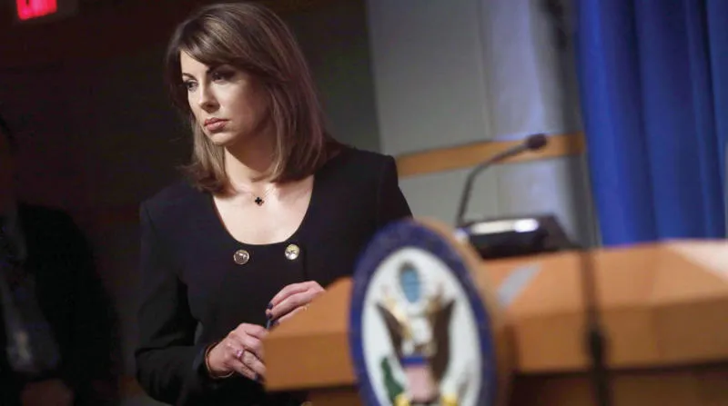 المتحدثة باسم الخارجية الأميركية مورغان أورتاغوس خلال مؤتمر صحافي الشهر الماضي (أ.ف.ب)
