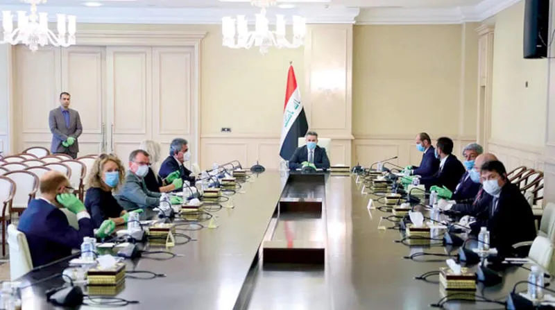 رئيس الوزراء العراقي المكلف عدنان الزرفي لدى لقائه سفراء دول الاتحاد الأوروبي في بغداد أمس (إ.ب.أ)