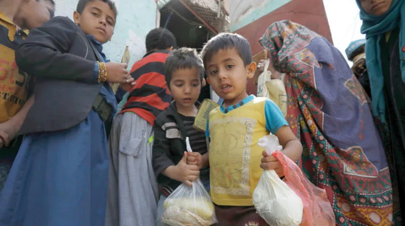 أطفال يحصلون على حصتهم من المساعدات في صنعاء (إ.ب.أ)