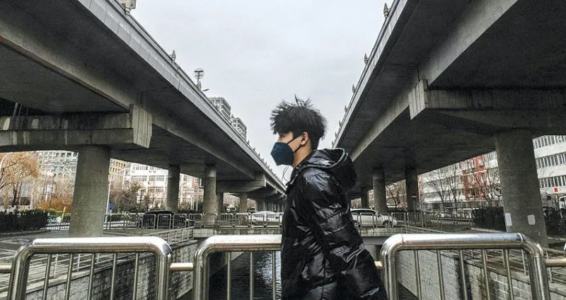 شاب في شارع شبه خالٍ من المارة في بكين الشهر الماضي (نيويورك تايمز)