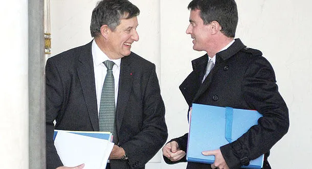 رئيس الوزراء الفرنسي مانويل فالس (يمين) يتحدث إلى الأمين العام لقصر الرئاسة جان بيار جوييه لال الاجتماع الحكومي في الإليزيه أمس (أ.ف.ب)