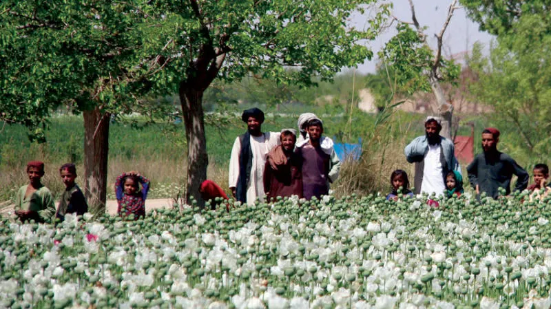 مزارعون أفغان يراقبون جنوداً خلال تدمير حقول مزروعة بنبتة الخشخاش التي يُستخرج منها الهيروين في «ناد علي» بولاية هلمند جنوب أفغانستان أمس (إ.ب.أ)
