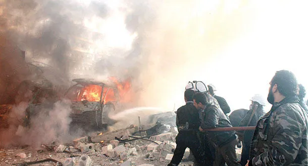 إطفائيون يحاولون إخماد حريق في مبنى استهدفته طائرات النظام في حي الفردوس وسط حلب أمس (أ.ف.ب)