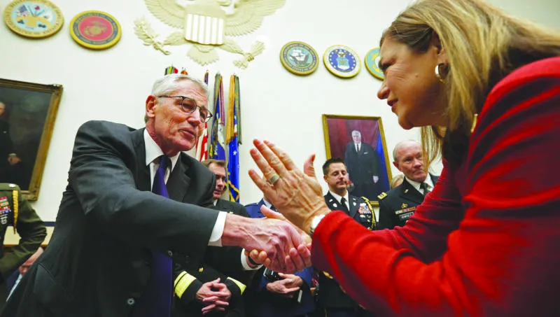 رئيسة لجنة القوات المسلحة في مجلس النواب البريطاني ترحب بوزير الدفاع الأميركي تشاك هيغل لدى وصوله إلى جلسة الاستماع أمس (إ.ف.ب)