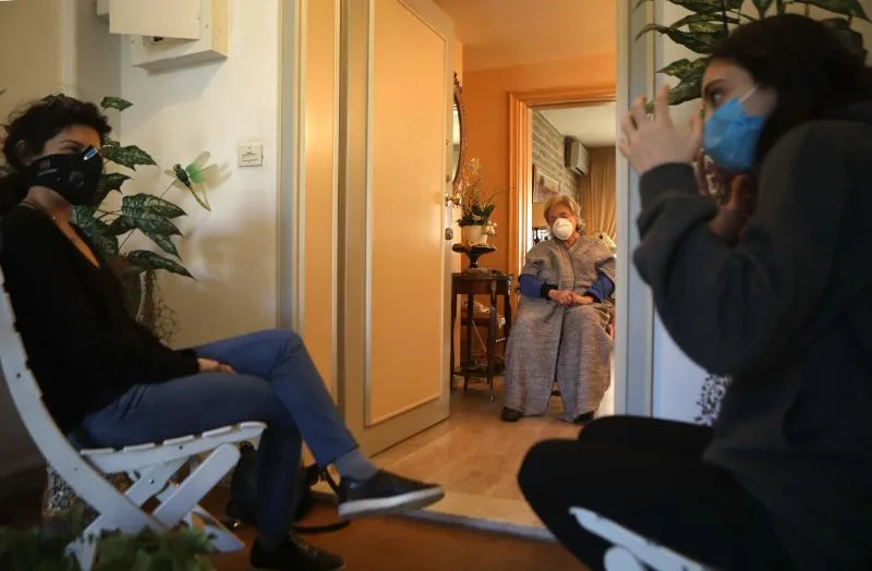 فتاتان لبنانيتان تجلسان متفرقتين تاركتين مسافة في أثناء زيارة والدتهما بالعاصمة بيروت (أ.ف.ب)