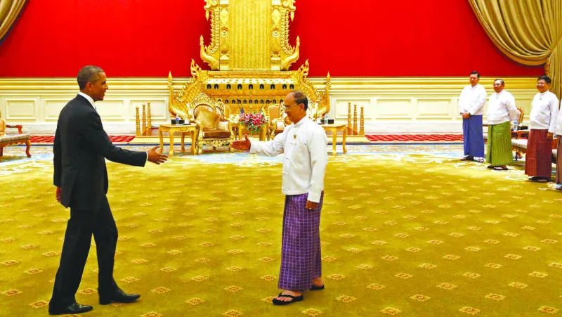 الرئيس الميانماري ثين سين أثناء ترحيبه بالرئيس الأميركي أوباما في القصر الرئاسي بالعاصمة نايبيداو أمس (رويترز)