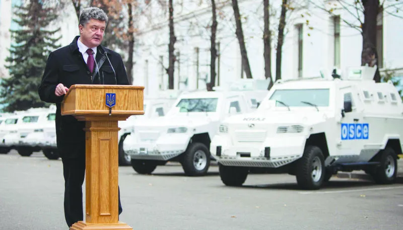 الرئيس بوروشينكو يلقي كلمة بمناسبة حفل تسليم عربات مدرعة إلى منظمة الأمن والتعاون الأوروبي بهدف استخدامها لمراقبة الوضع في شرق البلاد قرب مقر وزارة الدفاع في كييف أمس (رويترز)