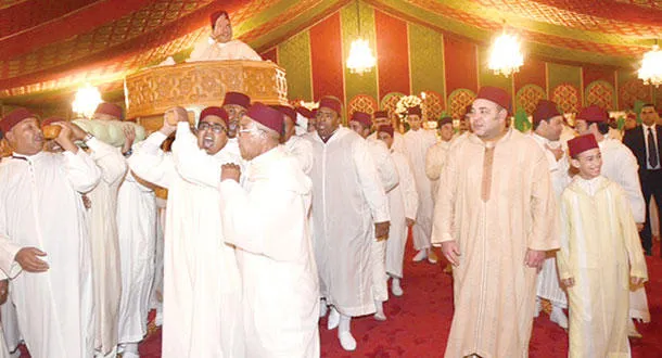 الملك محمد السادس وولي عهده الأمير مولاي الحسن أثناء حمل الأمير مولاي رشيد فوق «العمارية»