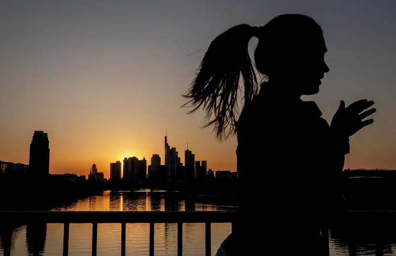 امرأة تجري فوق جسر في فرانكفورت بألمانيا (أ.ب)