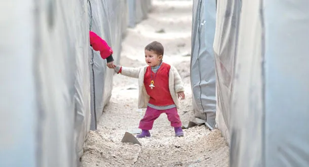 طفل من لاجئي كوباني يمسك بيد طفل آخر يسير بين الخيام في مخيم للاجئين بمنطقة سوروش قرب الحدود التركية - السورية أمس (أ.ب)
