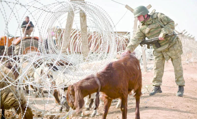 جندي تركي يحاول منع ماعز من عبور الأسلاك الشائكة للحدود التركية مع كوباني {عين العرب} أمس (أ.ب)