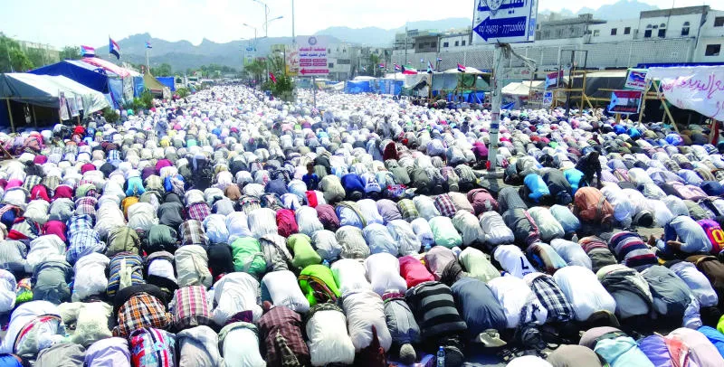 آلاف الجنوبيين يؤدون صلاة الجمعة في أعقاب مظاهرة تطالب بالانفصال عن الشمال في مدينة عدن الجنوبية أمس(أ.ف.ب)
