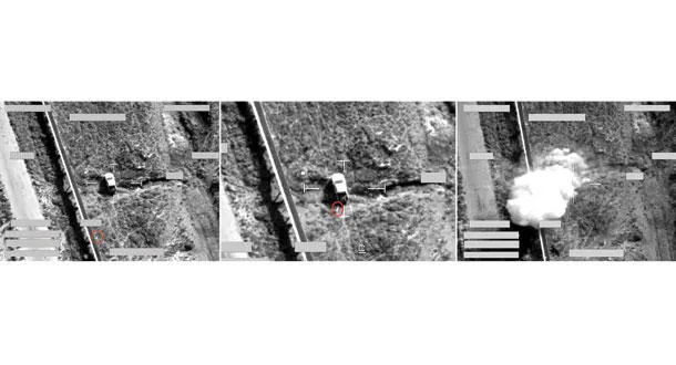من اليسار: صورة تظهر ضربة بصاروخ يتمتع بقدرة تحديد الهدف تابع للسلاح البريطاني على شاحنة تابعة لـ«داعش» في العراق (نيويورك تايمز)
