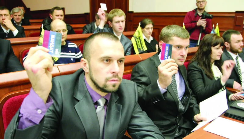 النواب المنتخبون حديثا لدى عقدهم أمس أول جلسة لبرلمان «جمهورية دونيتسك» المعلنة من جانب واحد في شرق أوكرانيا (إ.ب.أ)
