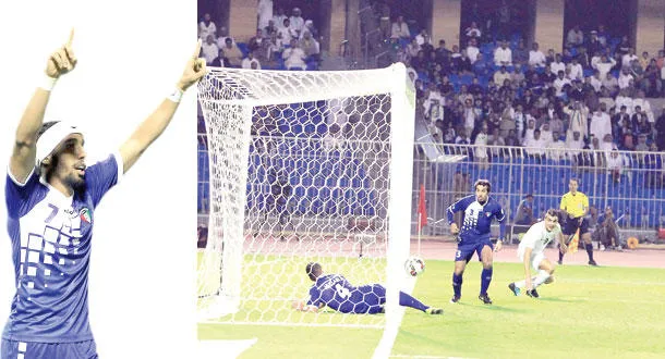 لقطة للفرصة التي شهدت جدلا واحتجاجا من لاعبي العراق بدعوى وجود ضربة جزاء نتيجة تصدي الكويتي حسين فاضل للكرة بيده (تصوير: حميد الحربي) - فهد العنزي محتفلا بالفوز على العراق أمس (تصوير: حميد الحربي)