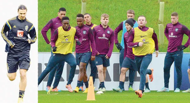 روني (الثاني من اليمين) يتقدم لاعبي إنجلترا خلال التدريبات أمس (أ.ف.ب) - إبراهيموفيتش استعاد لياقته وبات جاهزا لقيادة السويد اليوم (أ.ف.ب)