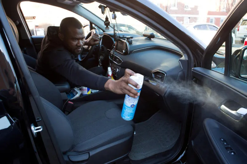 سائق في أوبر بمدينة نيويورك يقوم بتطهير سيارته من الفيروسات (رويترز)