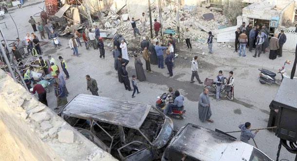 عراقيون يعاينون موقع انفجار وقع أول من أمس في منطقة الكريعات (أ.ب)