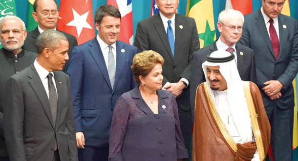 الأمير سلمان أثناء التقاط الصورة الجماعية لقادة الـ 20.. وإلى جواره رئيسة البرازيل وأوباما أمس (أ.ف.ب)