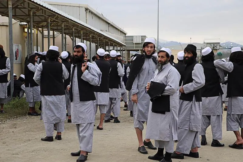 سجناء من حركة «طالبان» قبل إطلاق سراحهم من سجن «باغرام» شمال كابل (أ.ف.ب)
