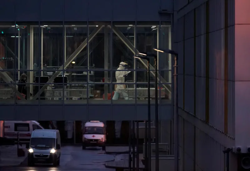 طبيب يرتدي ملابس واقية في مستشفى للمرضى المصابين بفيروس «كورونا» في ضواحي موسكو (رويترز)