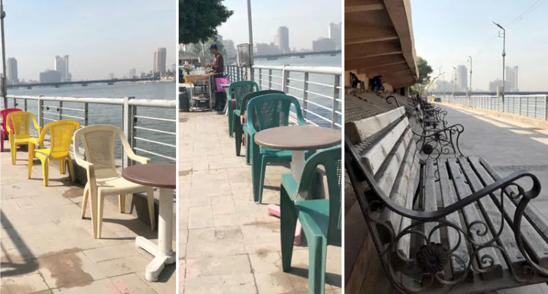 حاول عادل محمد، (طالب جامعي) الاقتراب أكثر من مياه النيل عند كورنيش منطقة ماسبيرو، خلال ساعات الصباح المبكرة، من أجل الاستمتاع أكثر بصفحة النهر البيضاء واستعادة الذكريات الدافئة التي شهد عليها النيل في هذا الموقع قبل أشهر، وبعد شروعه في النزول إلى الأسفل حيث الممشى الجديد، فوجئ بشاب ذي ملامح قمحية ينهره بنبرة حادة «التزم الجانب الأيمن»، لم يستوعب عادل سبب انفعال الشاب، إلّا بعد وصوله إلى مبتغاه، حيث شاهد عن قرب الشاب العصبي، وهو ينظف أرضية الممشى بالمياه وأدوات التنظيف البلاستيكية، وبمجرد جلوس عادل على مقعد خشبي محاولاً تأمل منظر النيل الرائع، باغته الشّاب ذاته بنبرة هادئة وناعمة هذه المرة: «هل تحب شرب شاي أو قهوة أو حاجة ساقعة يا أستاذ»، فأدرك عادل أنّه بائع مشروبات بالمنطقة.