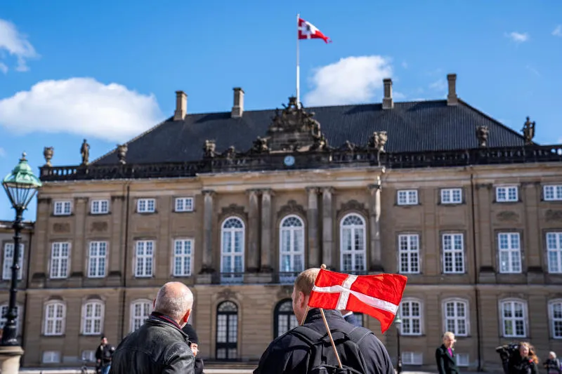 بعض الدنماركيين يحتفلون بعيد ملكة بلادهم أمام قصر فريدنسبورغ حيث تقيم (رويترز)