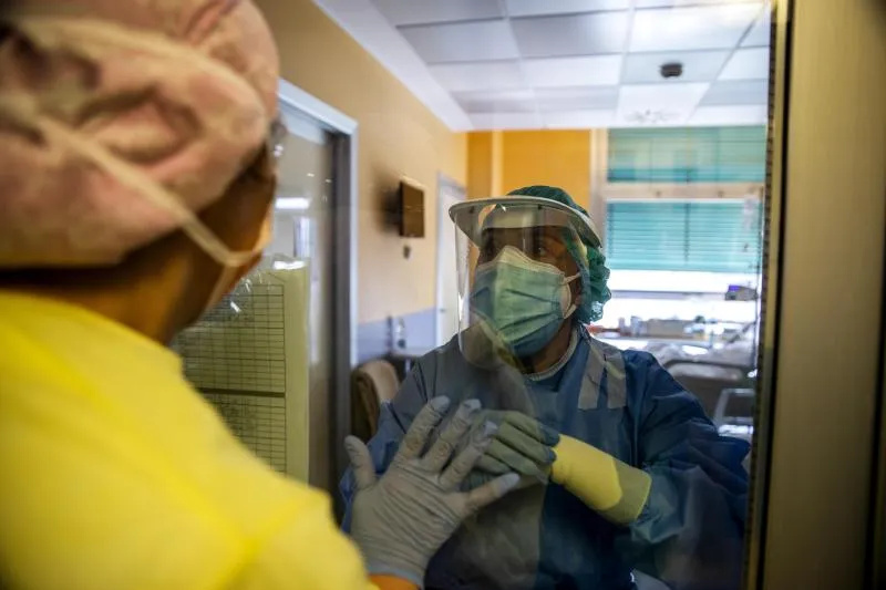 ممرضة تتواصل مع أحد زملائها في القسم الخاص بـ«كورونا» في مستشفى بميلانو (أ.ب)