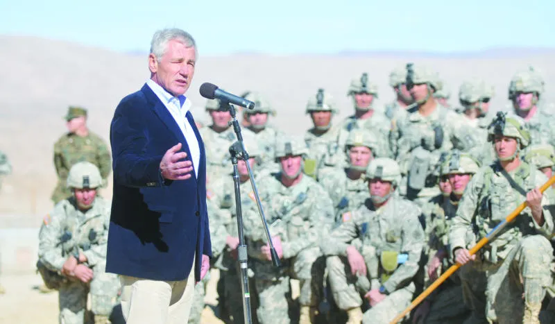 وزير الدفاع الأميركي تشاك هيغل يتحدث إلى جنود في مركز التدريب بفورت غروين بولاية كاليفورنيا أول من أمس (أ.ب)