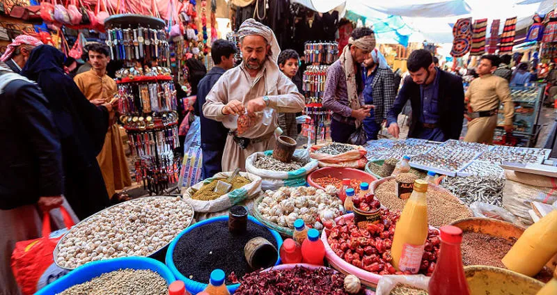 يمنيون في سوق وسط صنعاء القديمة (أ.ف.ب)